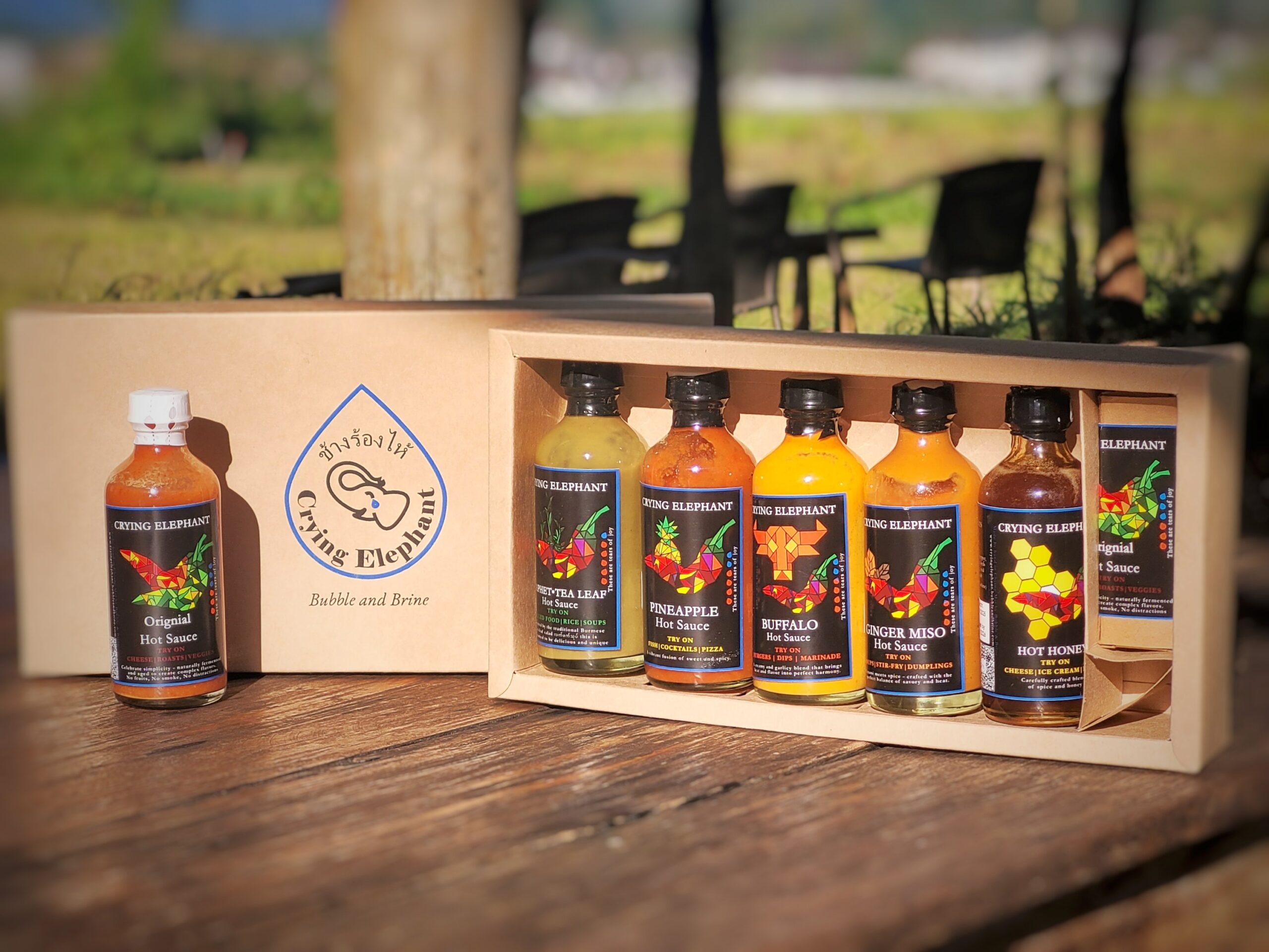 The Crying Elephant has 6 standard flavors. Original, Buffalo, Ginger Miso, Pineapple, Lahpet (tea leaf), and vegan Hot Honey